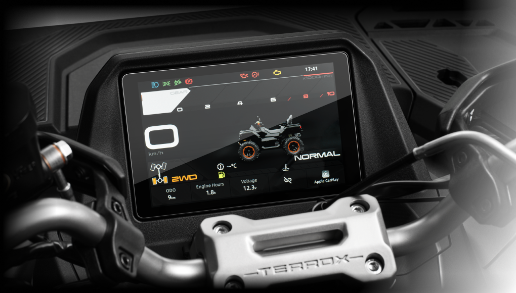 TERROX 1000 südameks on 963 cm³ V2 bensiinimootor, mis annab 90 hj ja 85 Nm. Oluline pole ainult jõud, vaid selle kontrollitavus: Bosch EFI sissepritse ja mitmetuumaline mootoriaju muudavad reageerimise sujuvaks ning loogiliseks. Juht saab valida kolme selgelt eristatava sõidurežiimi vahel – WORK, NORMAL ja SPORT – nende vahe on päriselt tajutav. WORK muudab gaasi rahulikumaks ja manööverdamise täpsemaks, NORMAL sobib igapäevaseks kasutuseks ja SPORT lisab teravust ning emotsiooni, kui rada seda lubab. Sõidumugavust toetab ka kiirusetundlik roolivõimendi (EPS), mis teeb aeglasel liikumisel juhtraua liikumise kergemaks ja suuremal kiirusel juhitavuse stabiilsemaks.